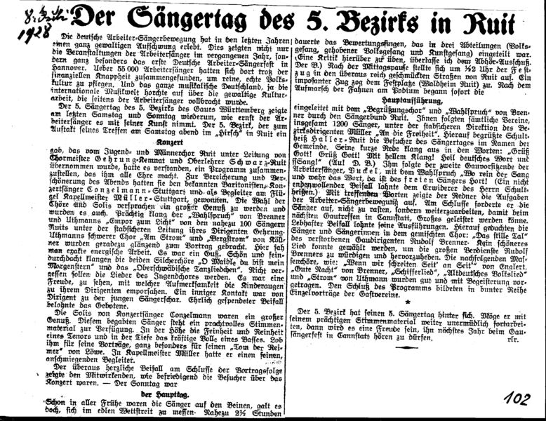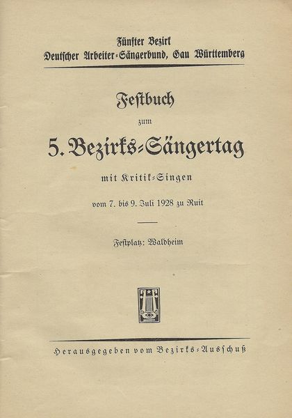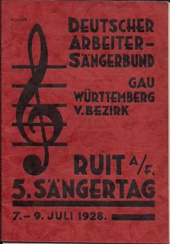 Mit der Währungsreform 1923 brachen die vielgerühmten »goldenen« zwanziger Jahre an, eine Epoche der Scheinblüte, wie sich später herausstellen sollte. Dennoch, auch dem Sängerbund ermöglichte sie einen abwechslungsreichen Vereinsbetrieb. Einen besonderen Höhepunkt stellte dabei zweifellos das 5. Bezirkssängerfest des Württemberggaues im Deutschen Arbeitersängerbund vom 7. bis 9. Juli 1928 in Ruit dar. Die gesamte Gemeinde beteiligte sich an den Vorbereitungen für ein Ereignis, das noch lange in aller Munde blieb.
